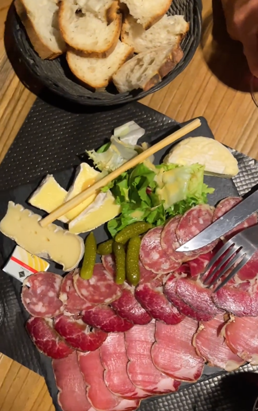 Camembert au lait cru chaud Coppa, lonzu, pommes de terres, salades